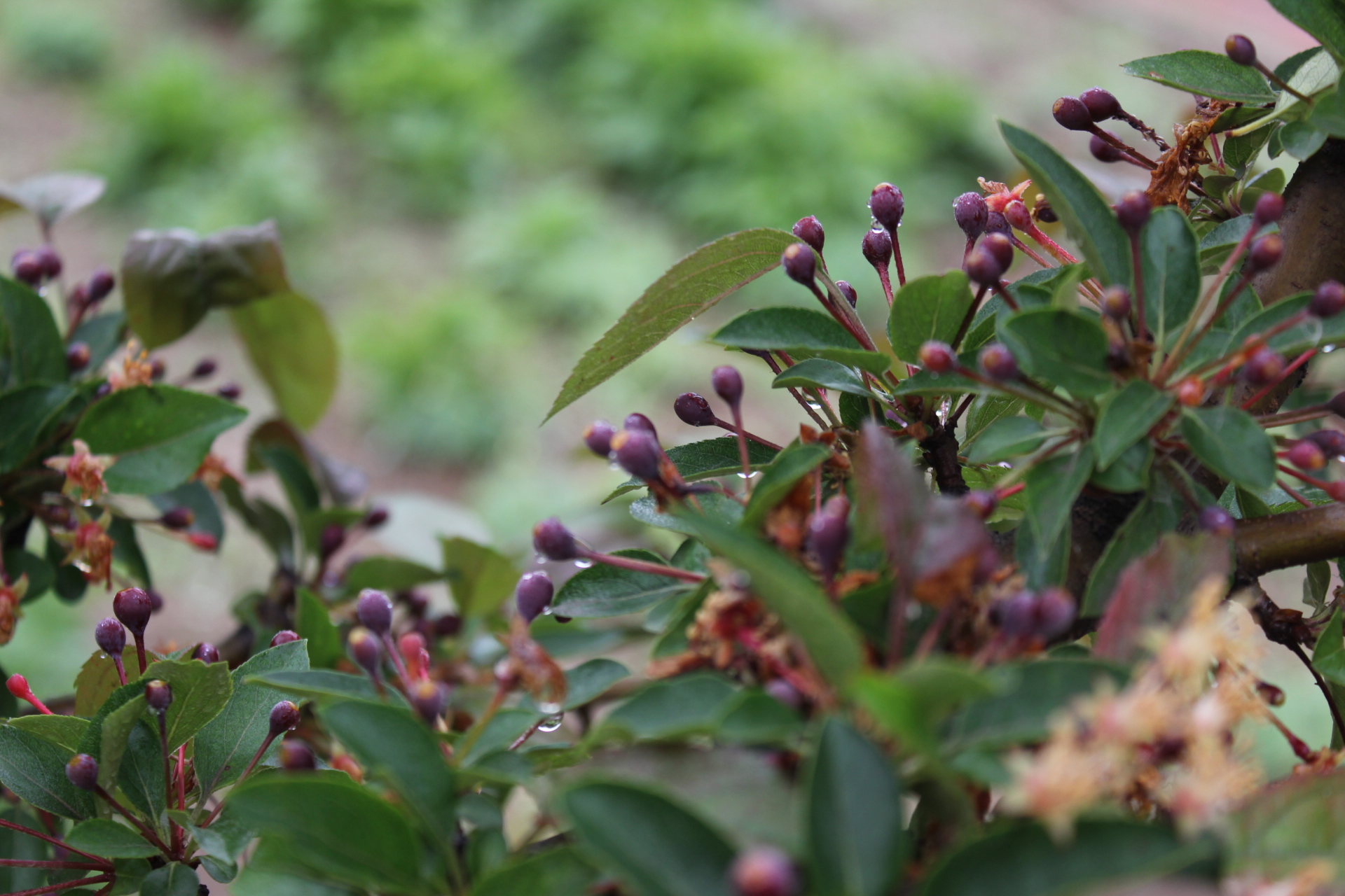This dwarf cultivar has a nice compact form and thick, leathery dark green leaves with an overcast of burgundy. The flowers open from red buds to blooms of fuchsia pink on white, to be followed by rich burgundy fruit. It is disease resistant.